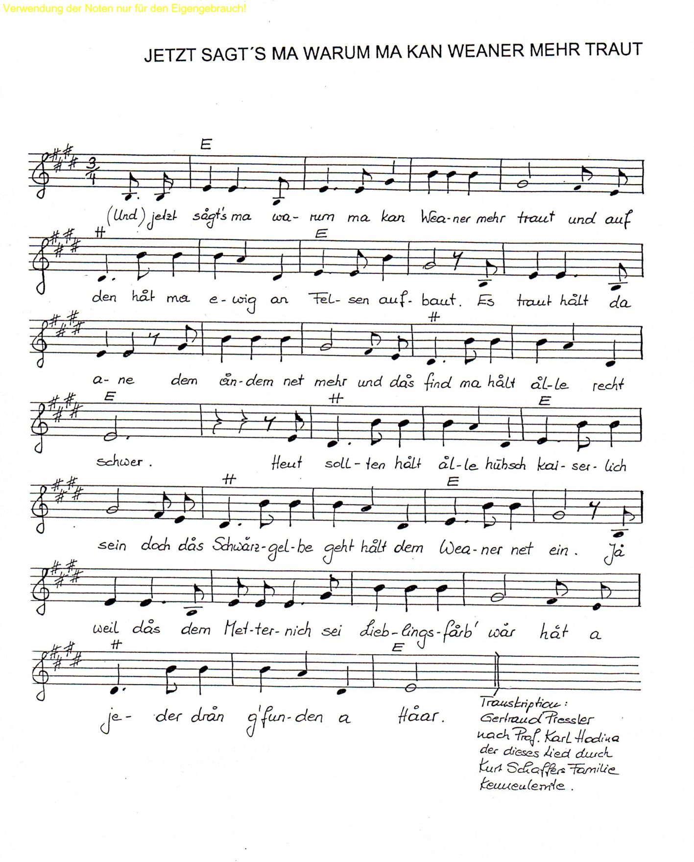 Dieses melodisch eher ländliche, einfache Wienerlied ist ein richtiger Ohrwurm, dessen Text sich in sozialer, historischer und politischer Hinsicht als sehr komplex und aufschlussreich erweist. Das Lied lässt sich anhand des Textes auf die Zeit um 1850 datieren. Es erinnert an die Folgen der Wiener Revolution 1848. Als nach Niederschlagung derselben die Zensur unter Metternich wieder eingeführt wurde, beherrschte allgemeines Missvertrauen das Zusammenleben. Dieses Misstrauen wird im Text "Jetzt sagt's ma warum ma kan Weaner mehr traut" thematisiert.