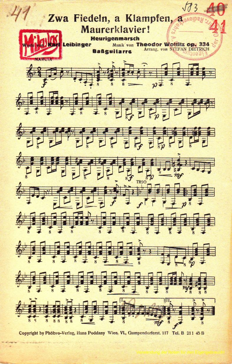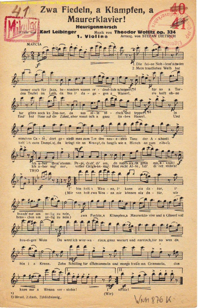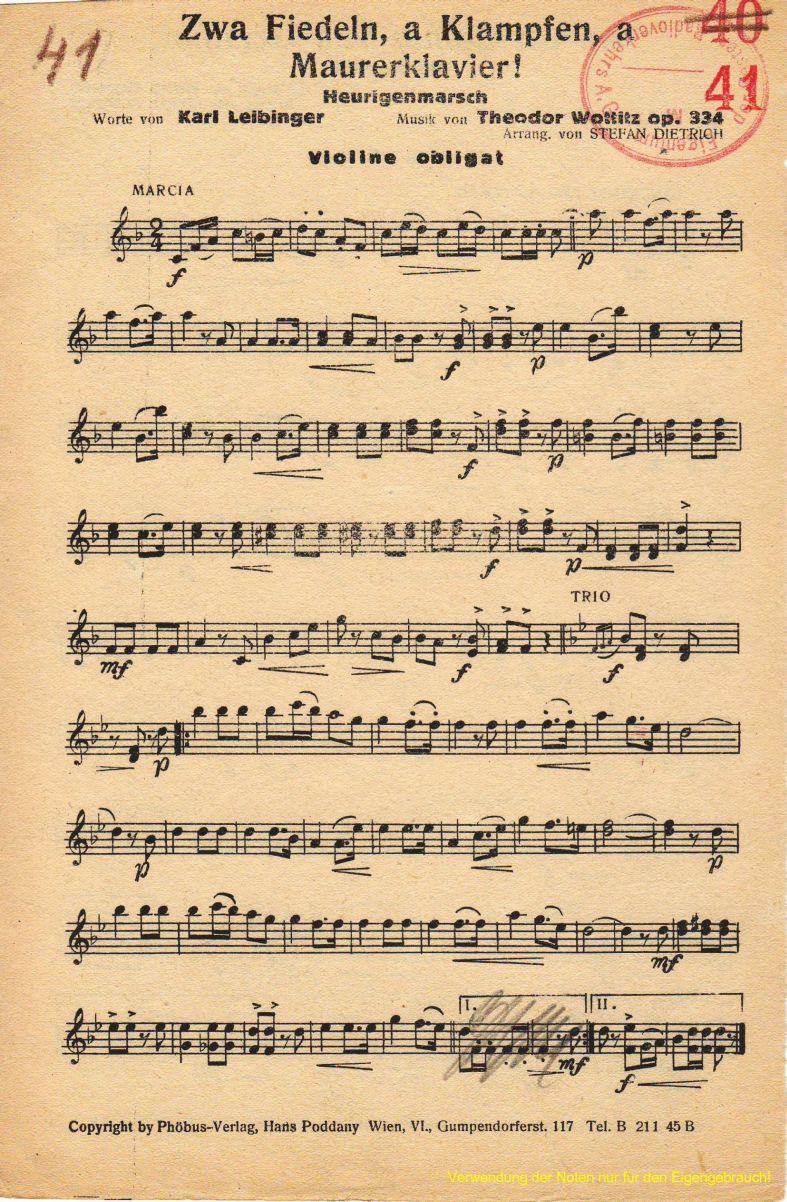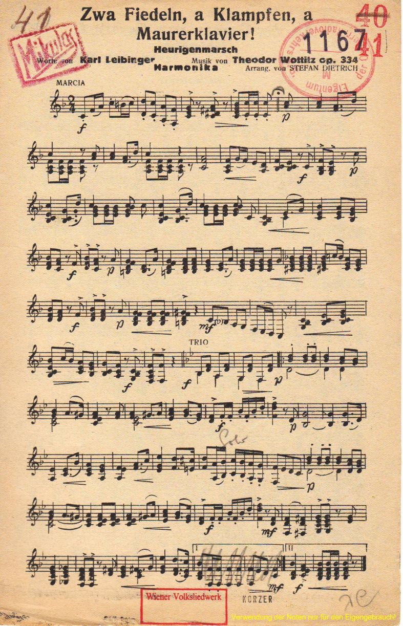 Zwa Fiedeln, a Klampfen, a Mauerklavier!: Heurigenmarsch von Theodor Wottitz, Op. 334 →